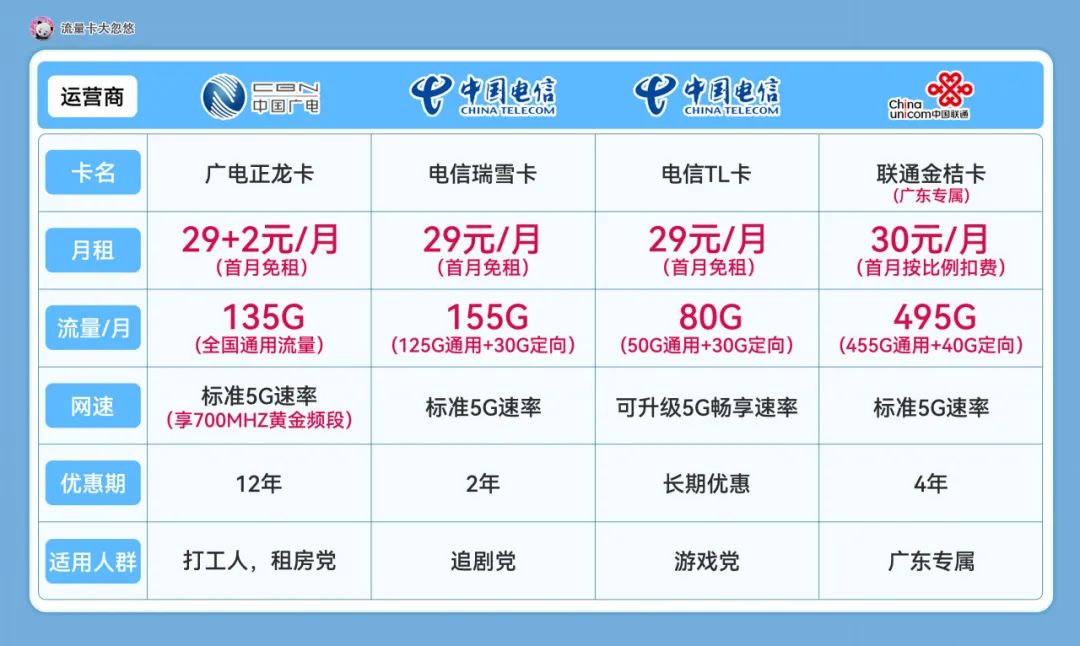 月租29元,70G流量(30G全国通用+40G广东省内定向流量)+100分钟免费通话全额到账;
