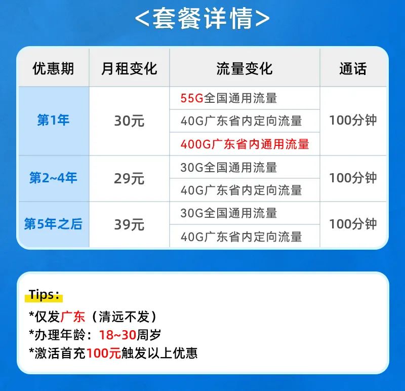 优惠套餐:30元55G全国通用+40G广东省内定向+400G广东省内通用+100分钟(第1年)